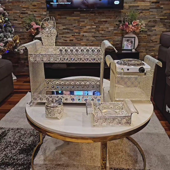 This set item is the best gold plate product for East African traditional coffee table. it comes as a set of, (1x coffee table, 1x stove holder, 1x Jebena holder, 1x Saucer, 1x sugar bowl, 1x electric stove and 1x electric coffee grinder).