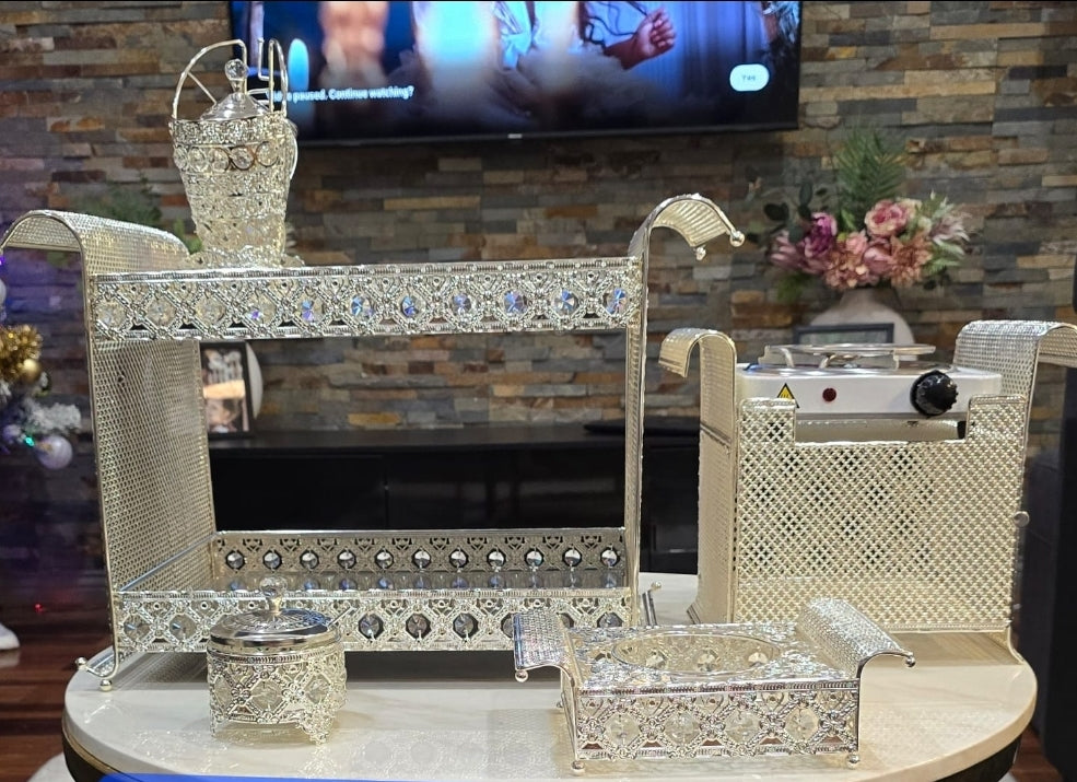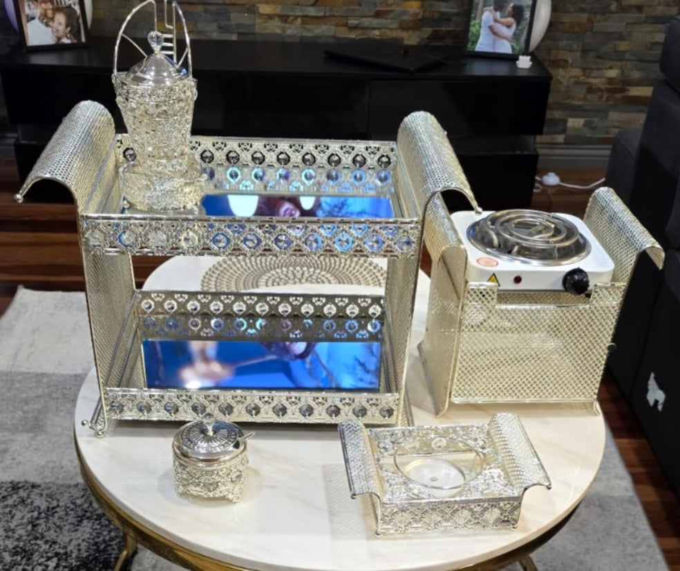Silver square Habesha coffee table set with extra electric stove, stove holder and electric coffee grinder